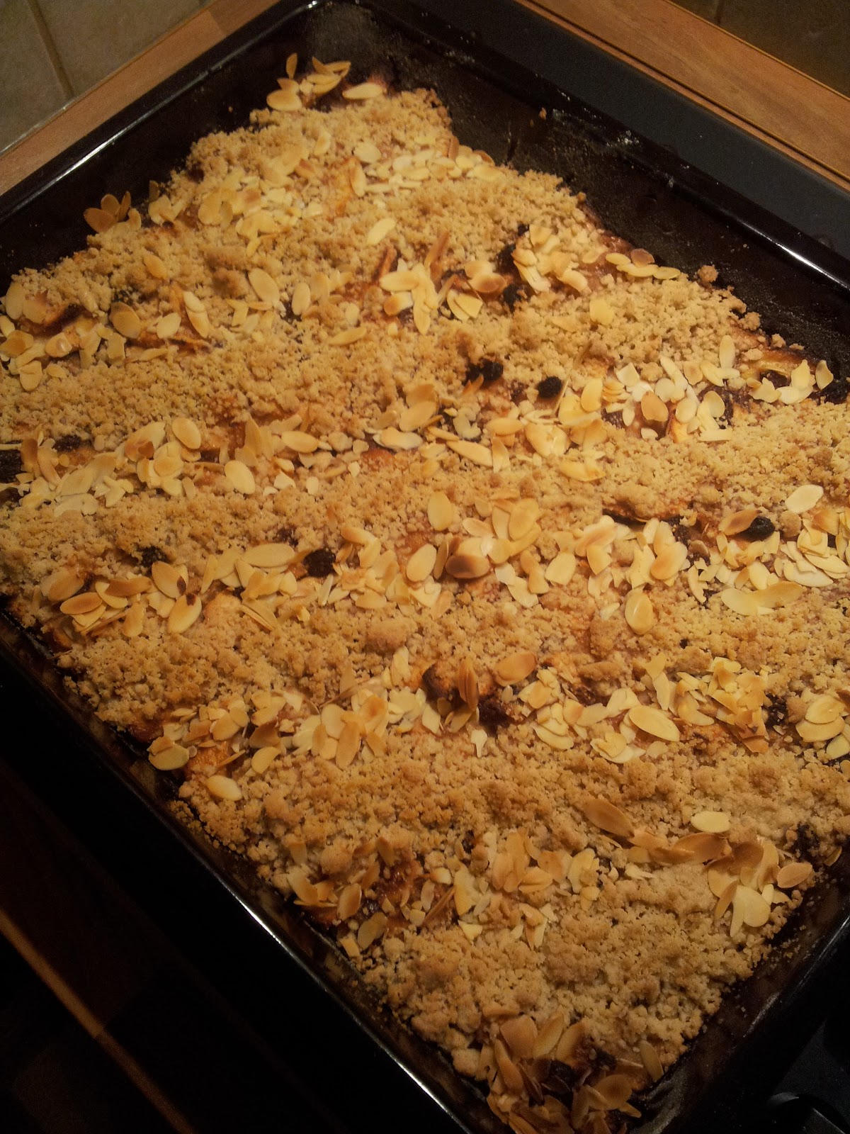 A morzsa tésztát átlósan kis hézagokkal a tésztára szórjuk, a hézagokat pedig kitöltjük a mandula forgácsokkal.